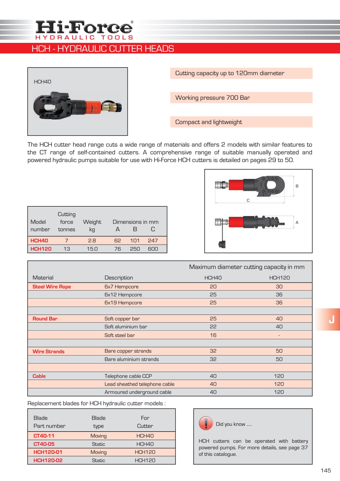 The HCH cutter head range cuts a wide range of materials and offers 2 models with similar features to the CT range of self-contained cutters. A comprehensive range of suitable manually operated and powered hydraulic pumps suitable for use with Hi-Force HCH cutters is detailed on pages 29 to 50.