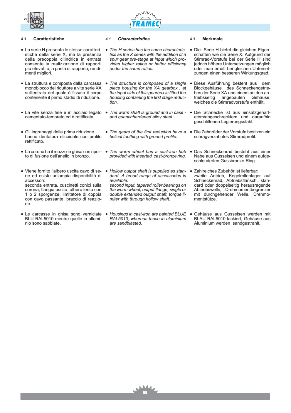 The H series has the same characteristic as the X series with the addition of a spur gear pre-stage at input which provides higher ratios or better efficiency under tthe same ratios.